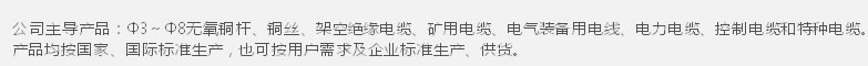 公司目前產品有:Φ3~Φ8無氧銅桿、銅絲、1-35kV裸電線、電氣裝備用電線、電力電纜、控制電纜和特種電纜。產品均按國家、國際標準生產,也可按用戶需求及企業標準生產、供貨。